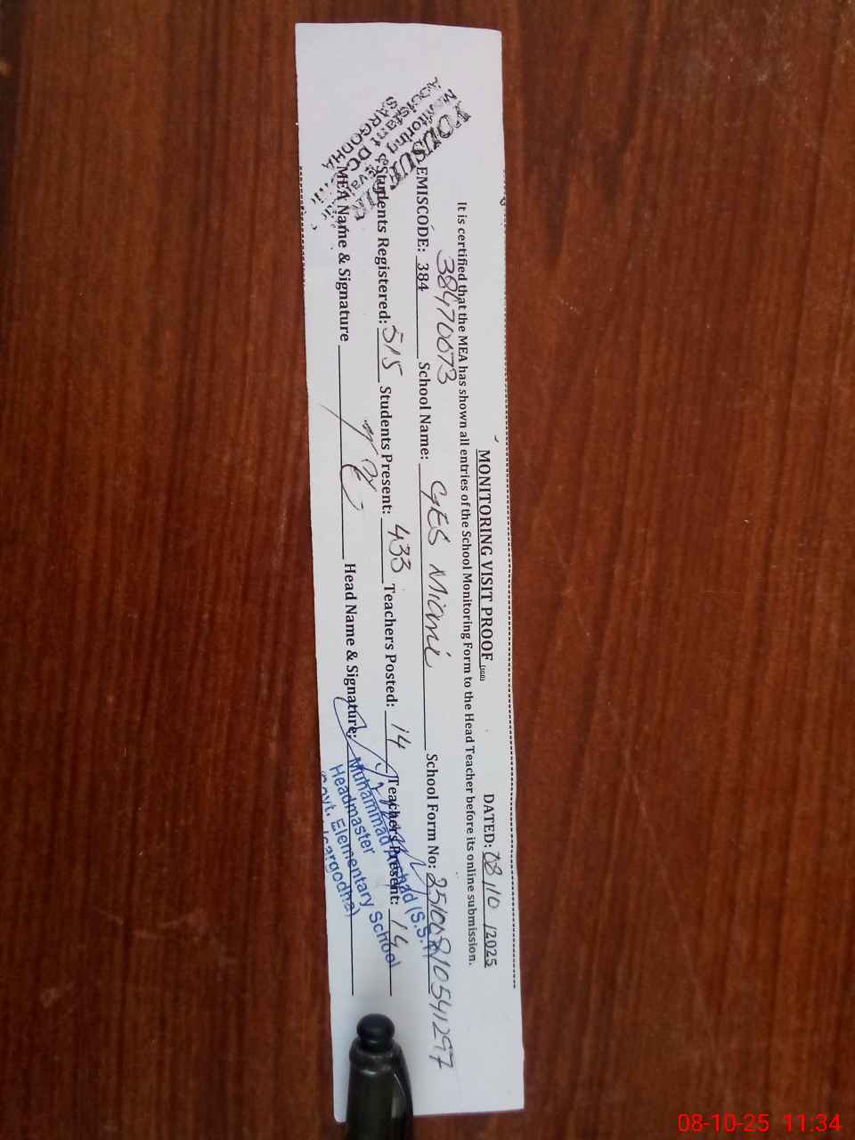 | Certified that this School was Inspected by the Undersigned MEA/DMO Today and the Information Stated Above is as Per Record. | |||||