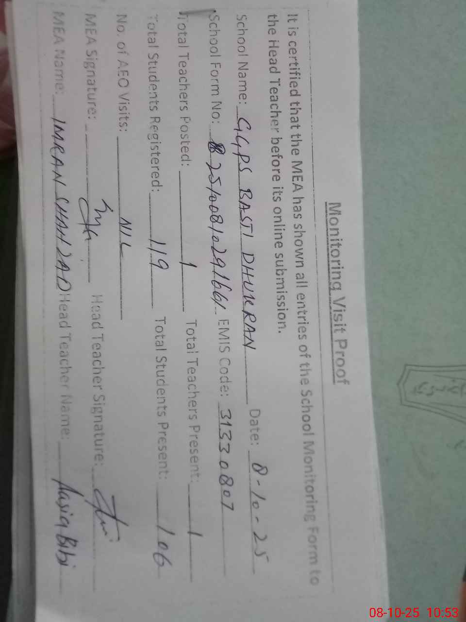 | Monitoring Date: 08-10-2025 | Start Time: 08-10-2025 10:29 AM | End Time: 08-10-2025 10:54 AM | Name of MEA: Im**** Sh**** | |