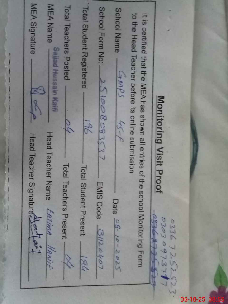 | Name: Fa**** Ha**** Designation: (School Headmaster's/Headmistress's) PST Phone/Cell Number: 03**** |
