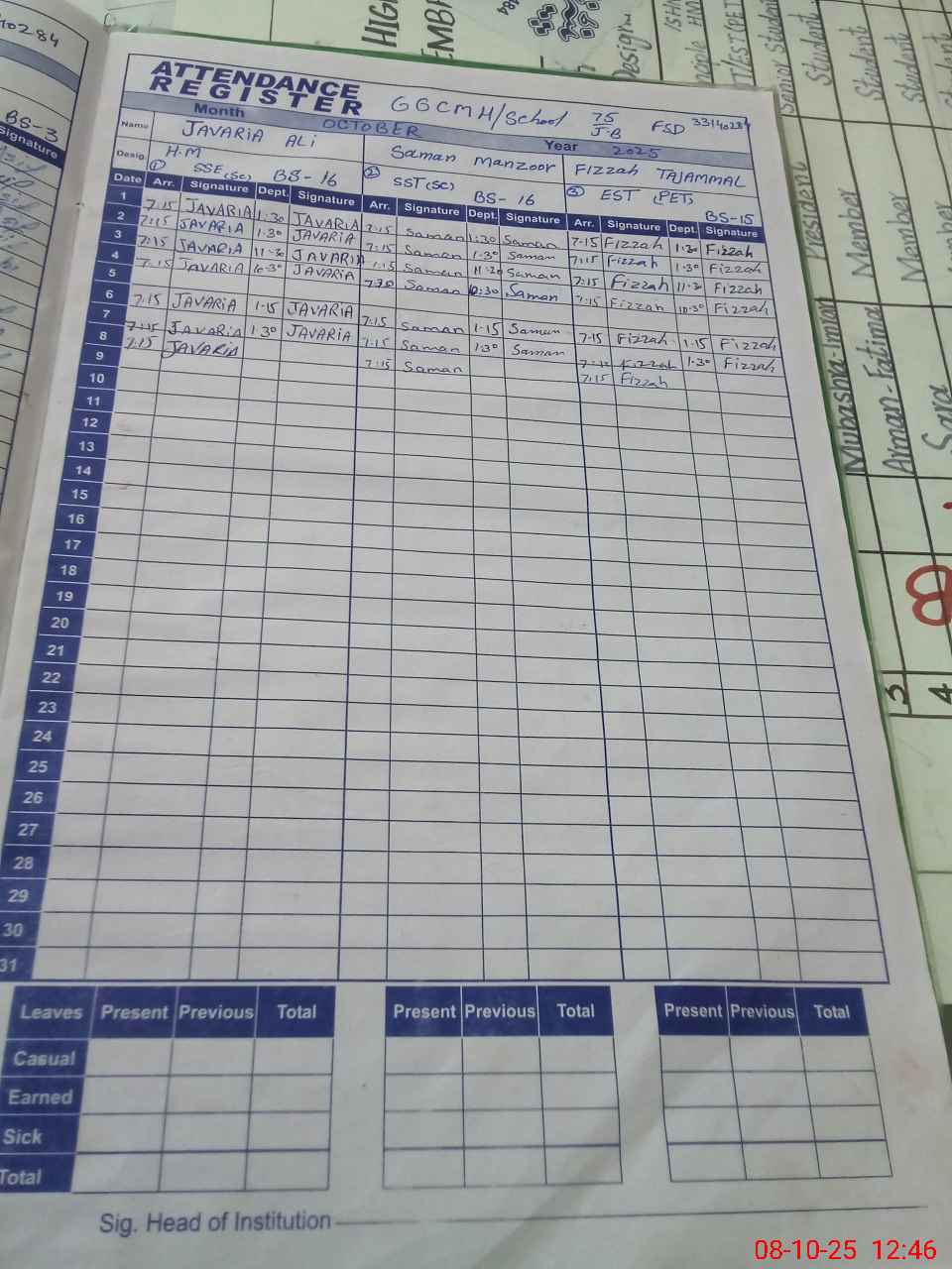 | CNIC | Full Name | Designation | R/C | Absence During Last Calender Month |