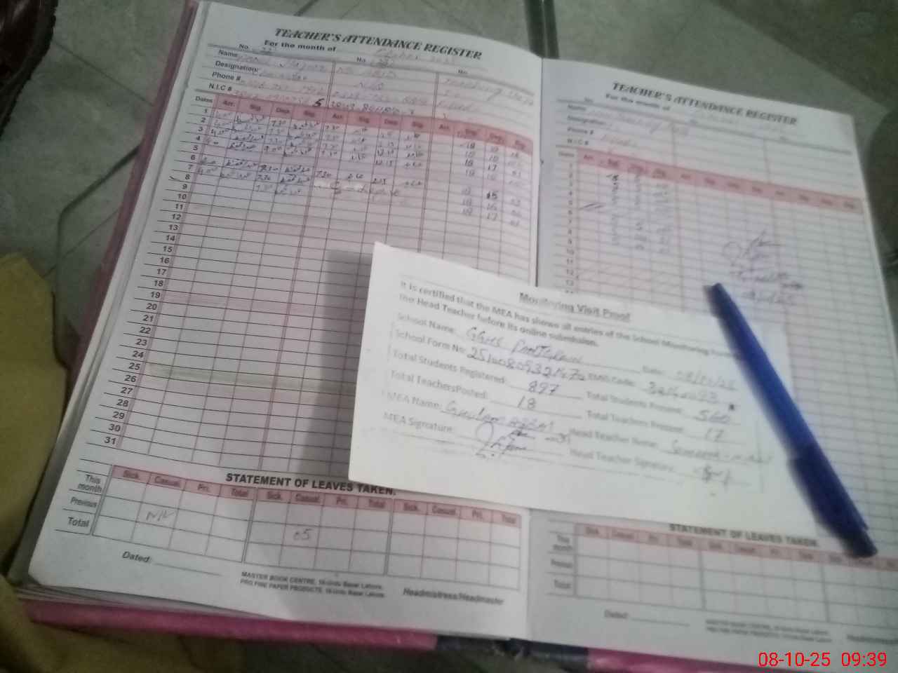 | Attendance Register | Head Teacher | MEA with School | Visit Proof |