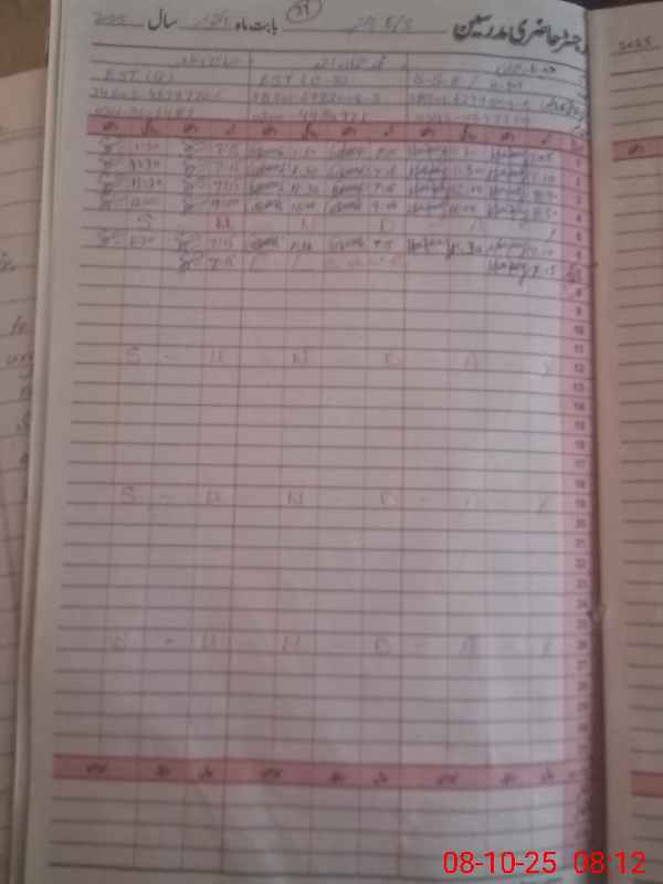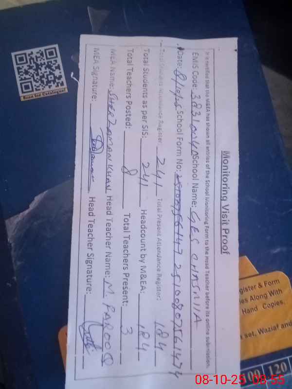 | Total no. of Classrooms: 9 No. of Classrooms Used for Teaching: 9 No. of Classrooms Storing Old Furniture, FTBs, etc: 0Comments if Any: SSE Hafeez ur Rehman EST Muhammad Usman EST Abdul Ghaffar and EST Muhammad Shahid were not physically present and also Ecc class attendance register not maintain since 1 oct 2025 |