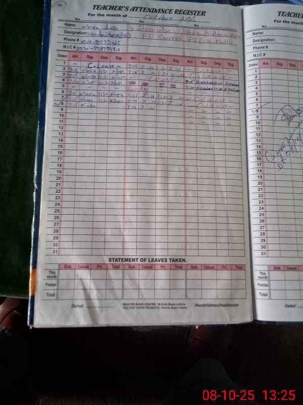 | Total no. of Classrooms: 5 No. of Classrooms Used for Teaching: 4 No. of Classrooms Storing Old Furniture, FTBs, etc: 0Comments if Any: The name of PST QURAT UL AIN was not exist in MEA TAB |