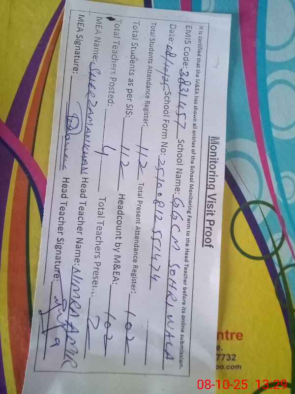 | Attendance Register | Head Teacher | MEA with School | Visit Proof |