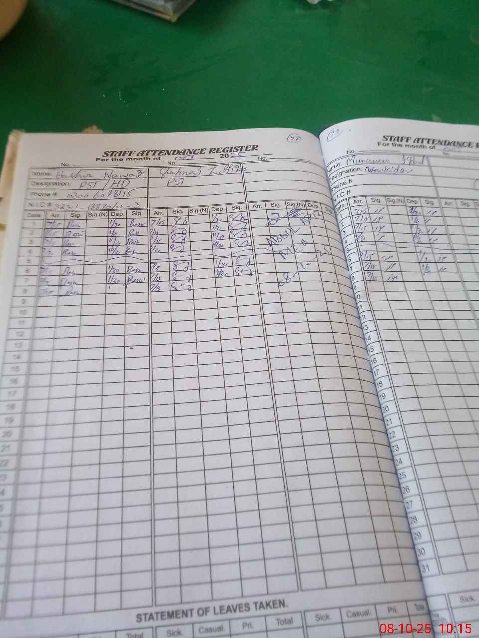 | CNIC | Full Name | Designation | R/C | Absence During Last Calender Month |