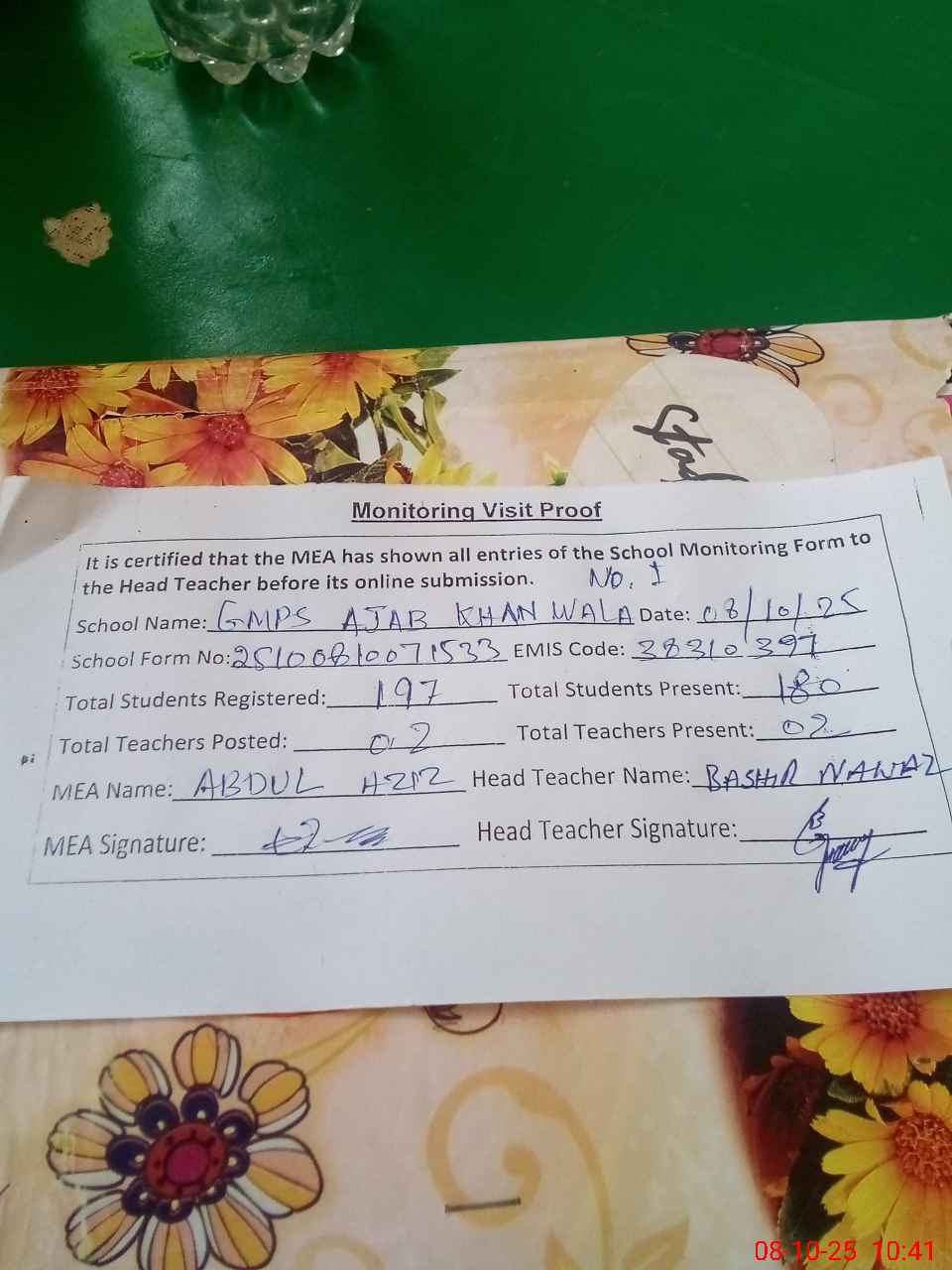 | Certified that this School was Inspected by the Undersigned MEA/DMO Today and the Information Stated Above is as Per Record. | |||||
