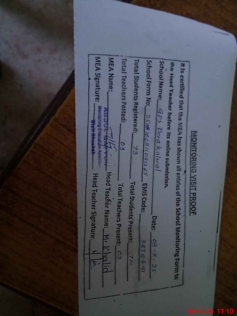 | Attendance Register | Head Teacher | MEA with School | Visit Proof |