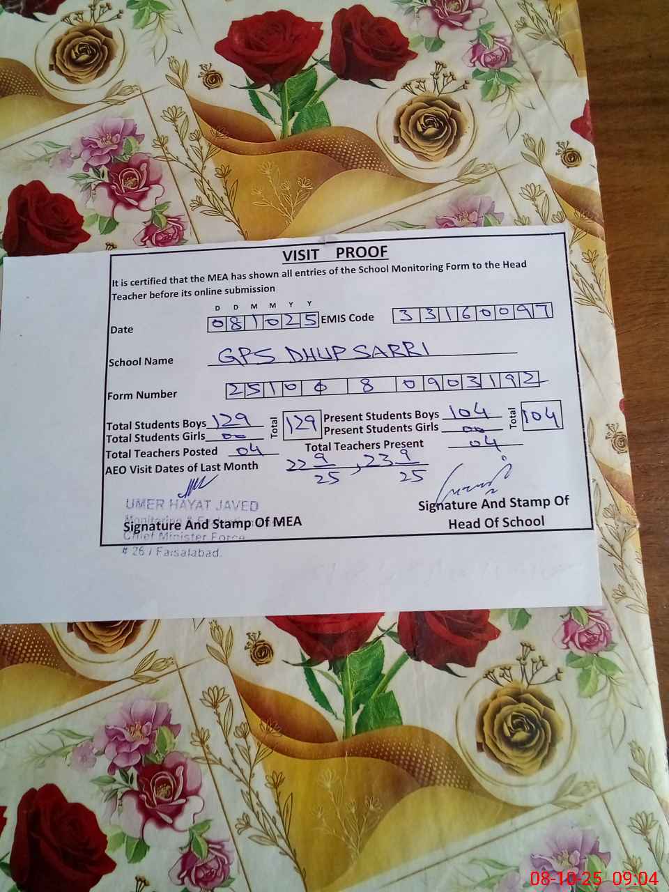 | Attendance Register | Head Teacher | MEA with School | Visit Proof |