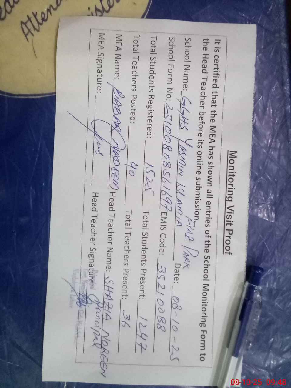 | Certified that this School was Inspected by the Undersigned MEA/DMO Today and the Information Stated Above is as Per Record. | |||||