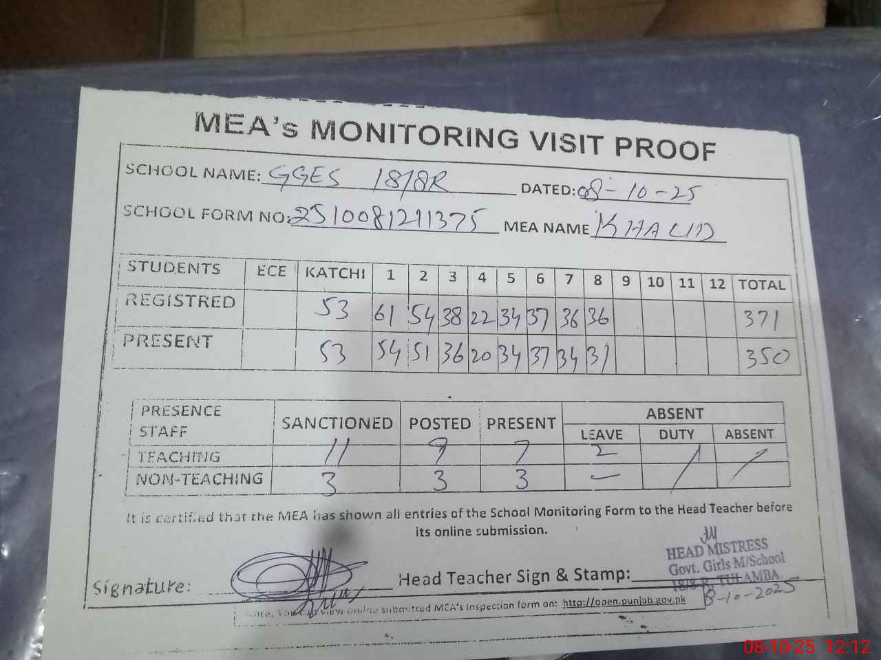 | Attendance Register | Head Teacher | MEA with School | Visit Proof |