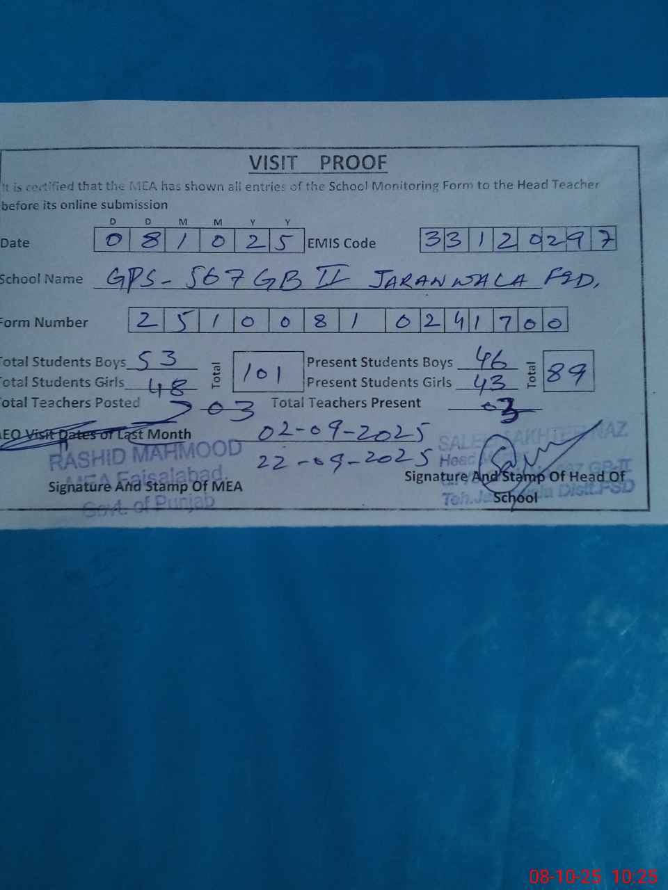 | Attendance Register | Head Teacher | MEA with School | Visit Proof |