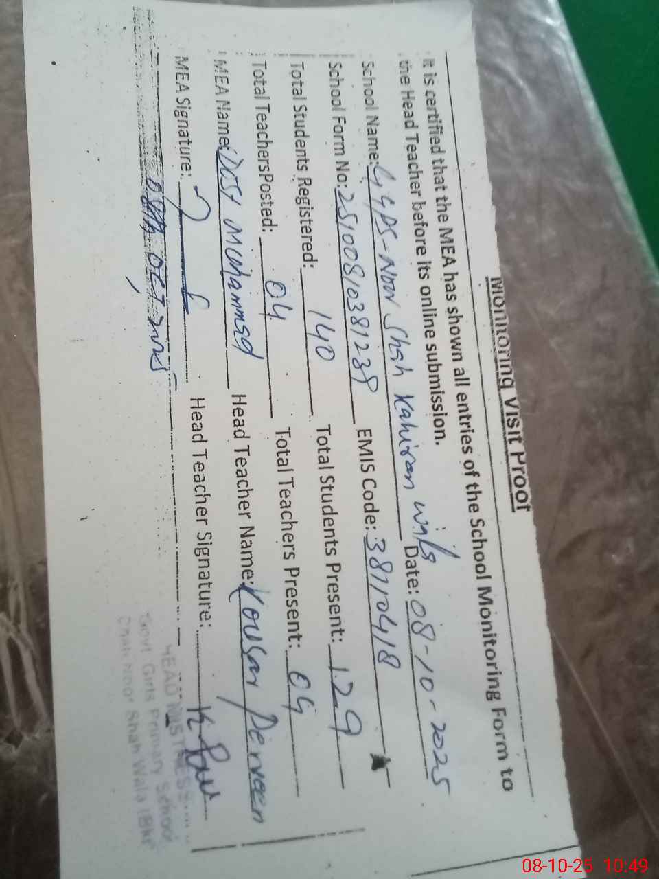 | Attendance Register | Head Teacher | MEA with School | Visit Proof |