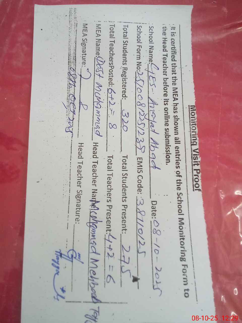 | EMIS Code: 38110125 | Name of School: GES ANAYAT ABAD | |||