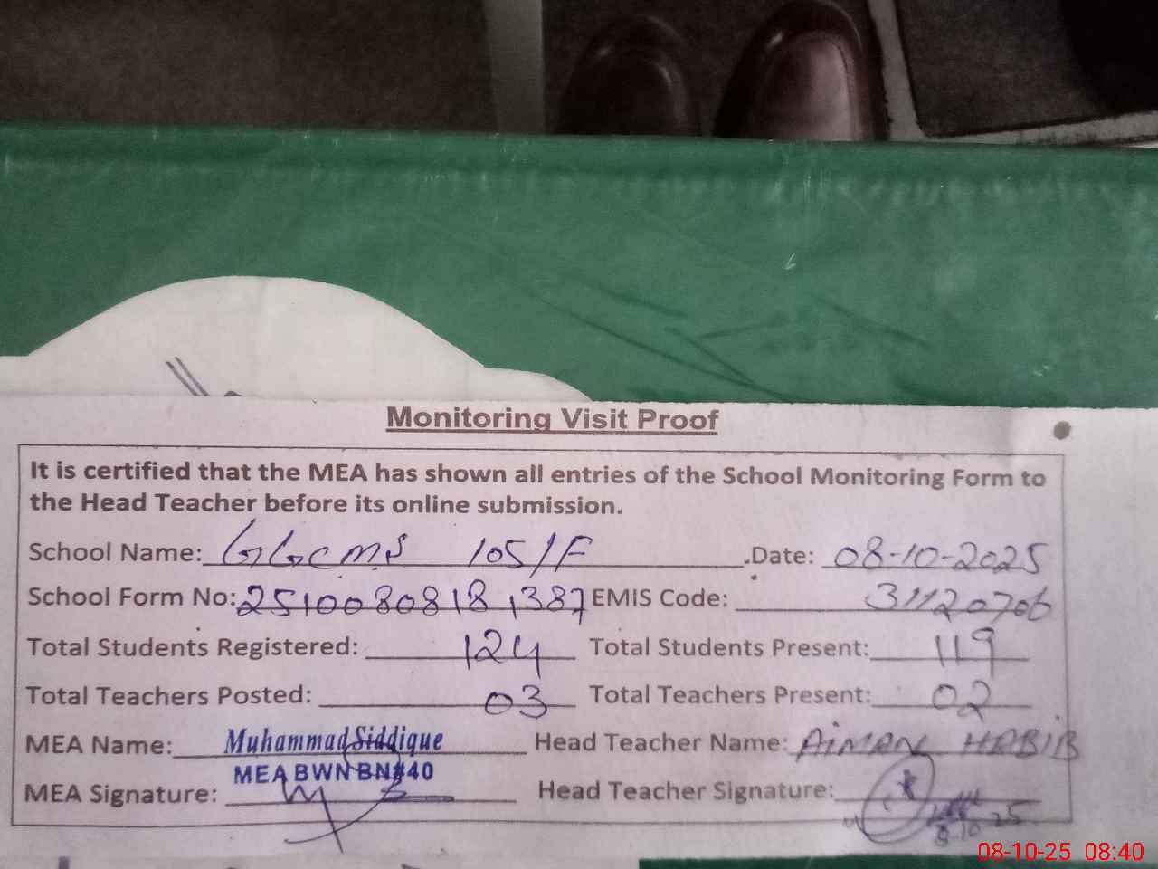 | Certified that this School was Inspected by the Undersigned MEA/DMO Today and the Information Stated Above is as Per Record. | |||||