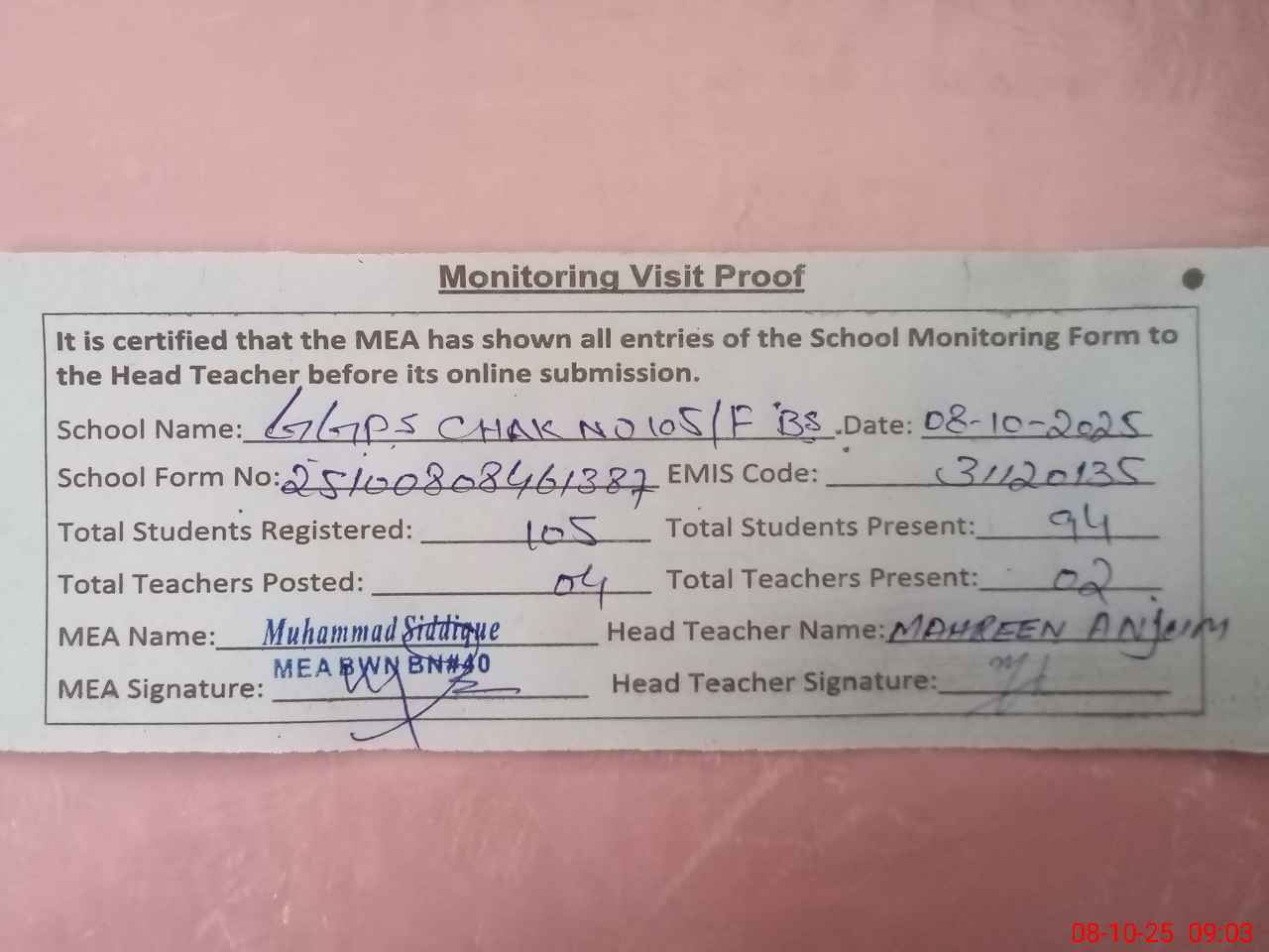 | Certified that this School was Inspected by the Undersigned MEA/DMO Today and the Information Stated Above is as Per Record. | |||||
