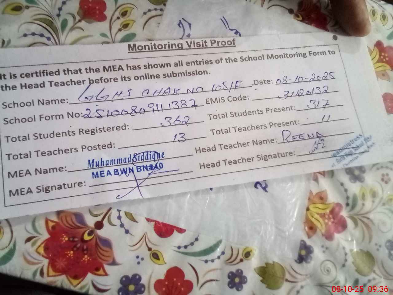 | Attendance Register | Head Teacher | MEA with School | Visit Proof |