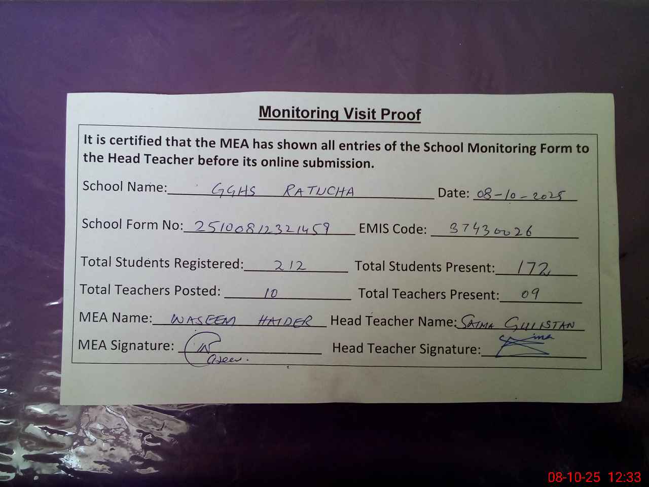 | Attendance Register | Head Teacher | MEA with School | Visit Proof |