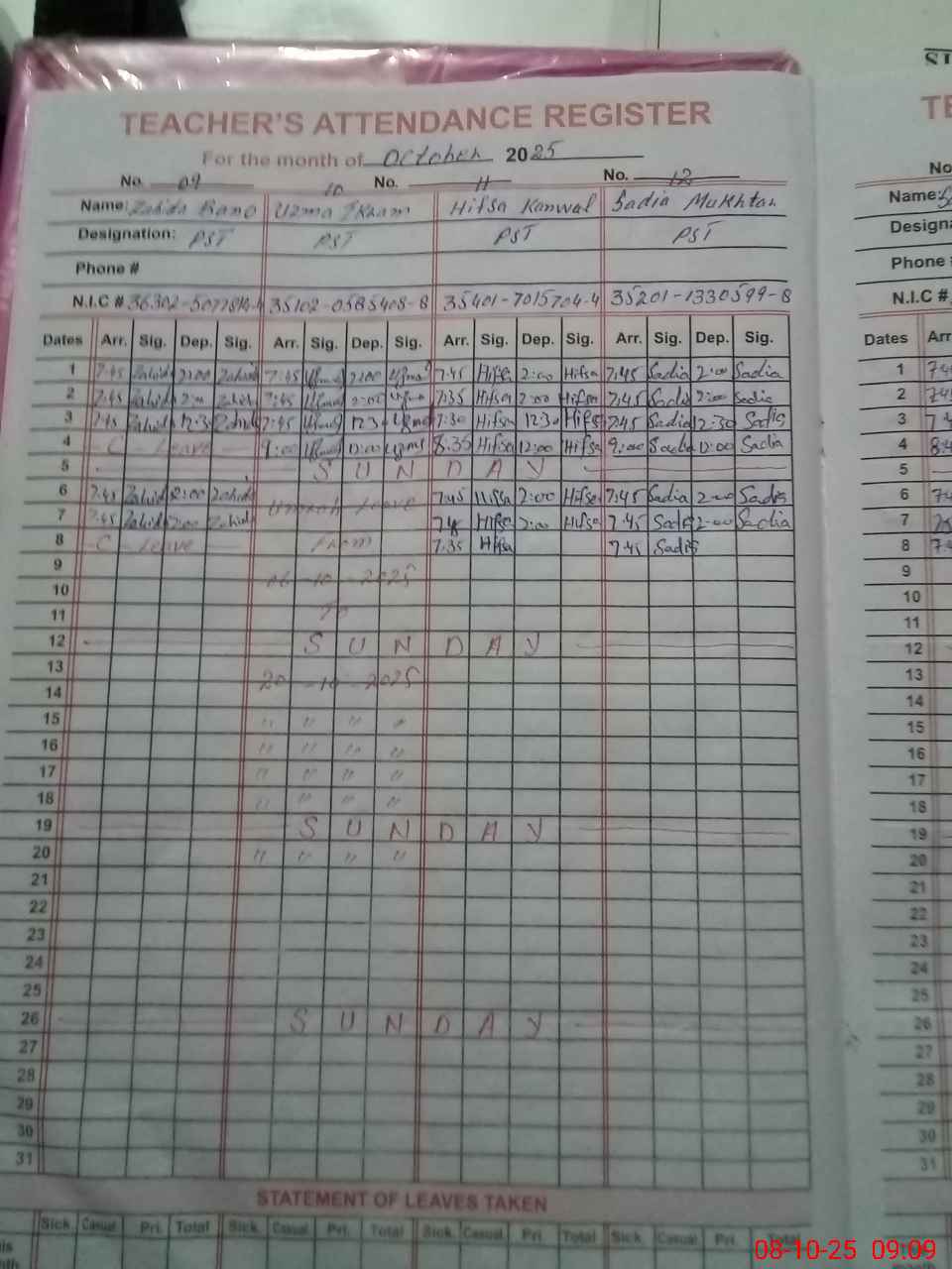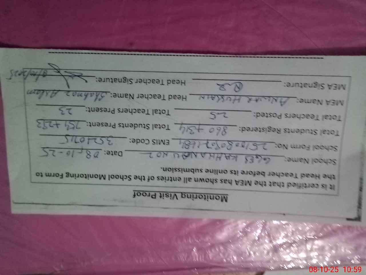 | Remarks (Use Separate Page if Required): Akhtar Hussain SG as per attendance register on official duty but valid authority not available School consist two camps Muhammad Sadiq NQ attached to secondary camp of this School from GGPS Dullu Kalan he has died on 09 September 2025 in school Secondary consist on 05 class Room and 05 wash room not entered in this School data Boring process for motor in secondary camp 35210715 | |||||
