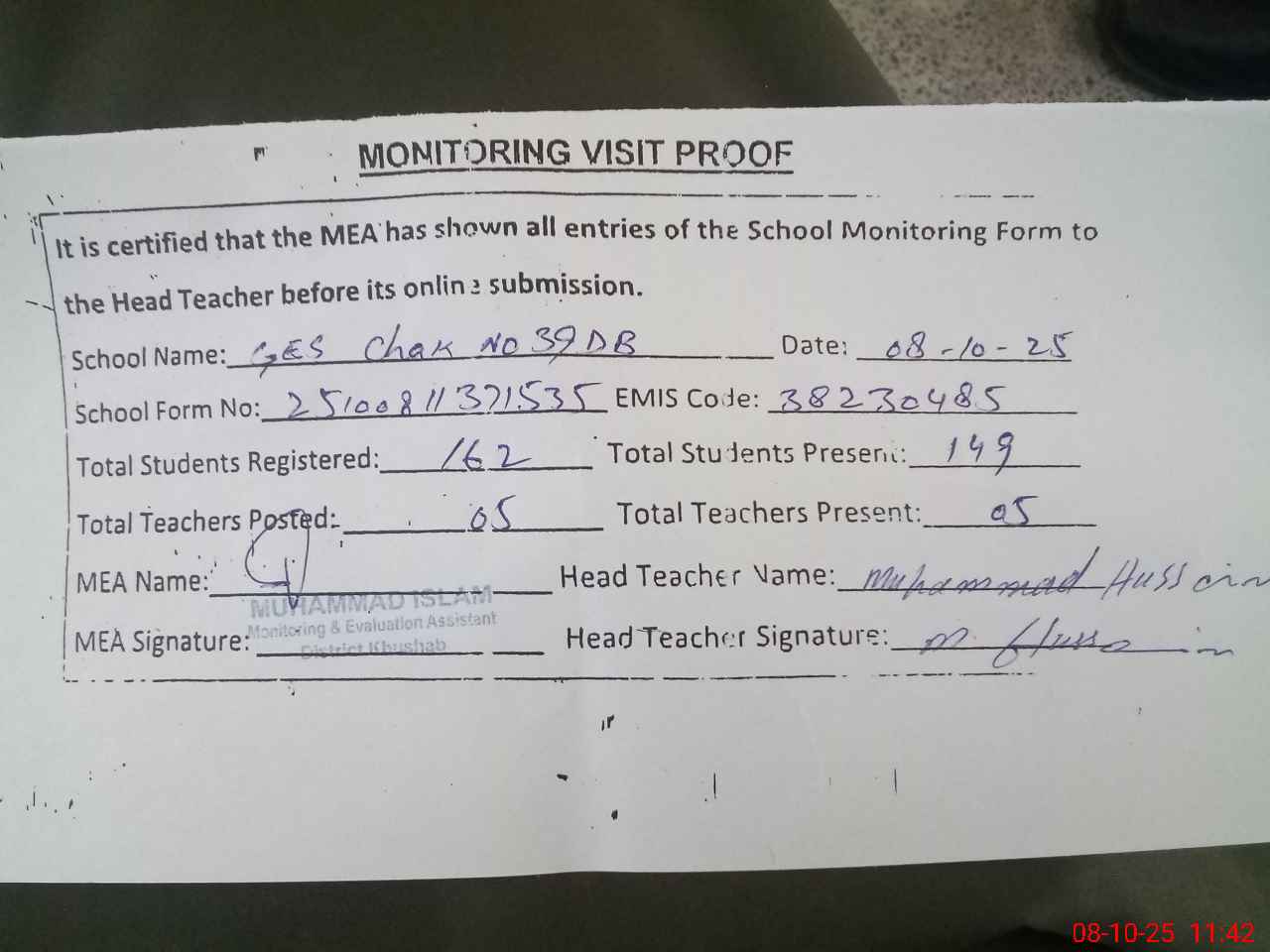 | Attendance Register | Head Teacher | MEA with School | Visit Proof |