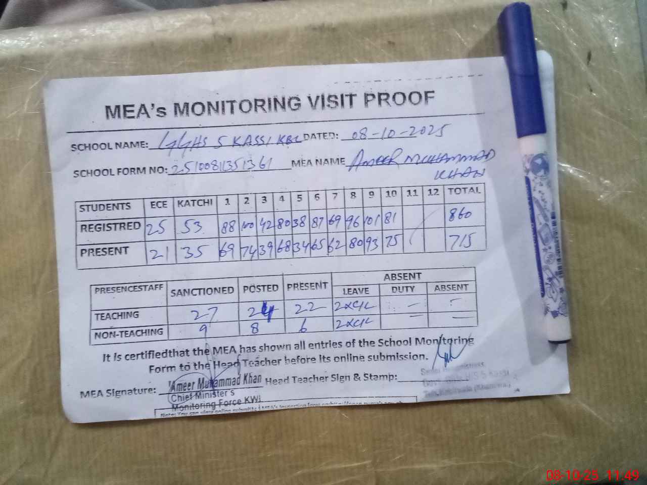 | Attendance Register | Head Teacher | MEA with School | Visit Proof |