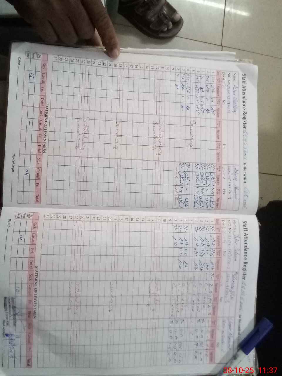 | CNIC | Full Name | Designation | R/C | Absence During Last Calender Month |
