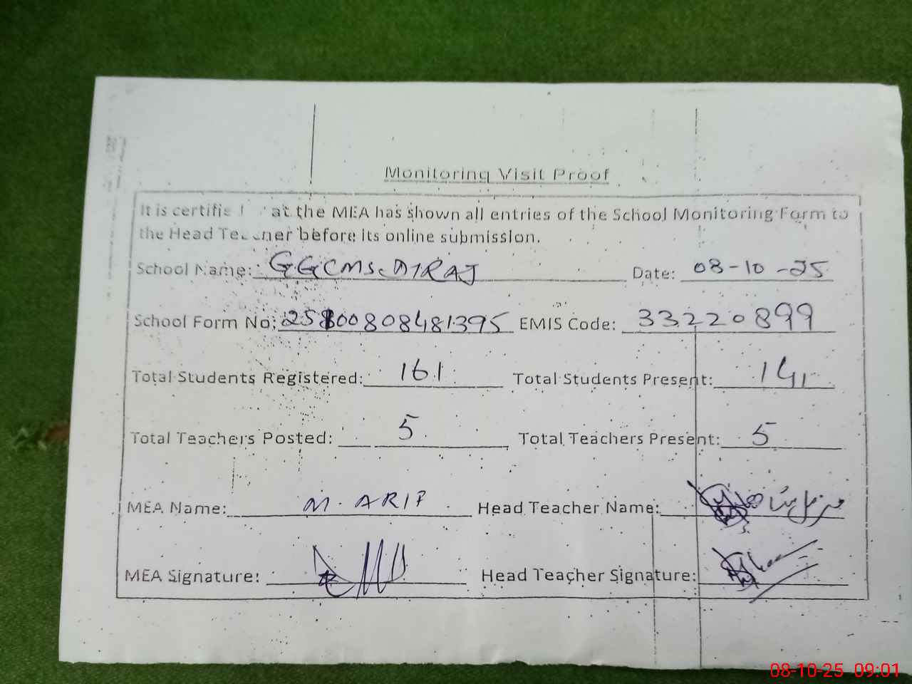 | Attendance Register | Head Teacher | MEA with School | Visit Proof |