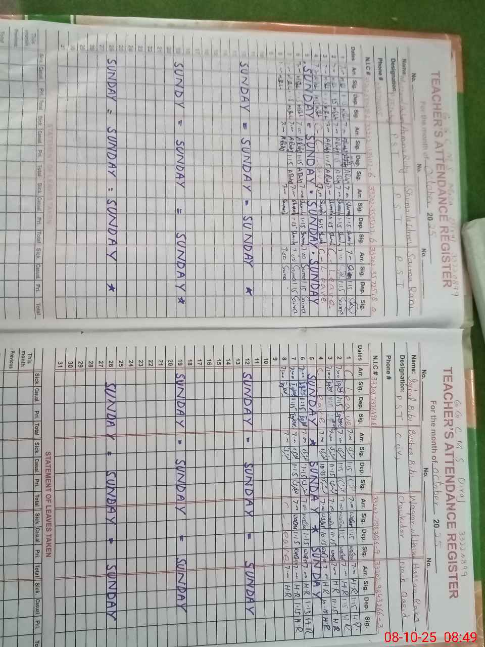 | CNIC | Full Name | Designation | R/C | Absence During Last Calender Month |