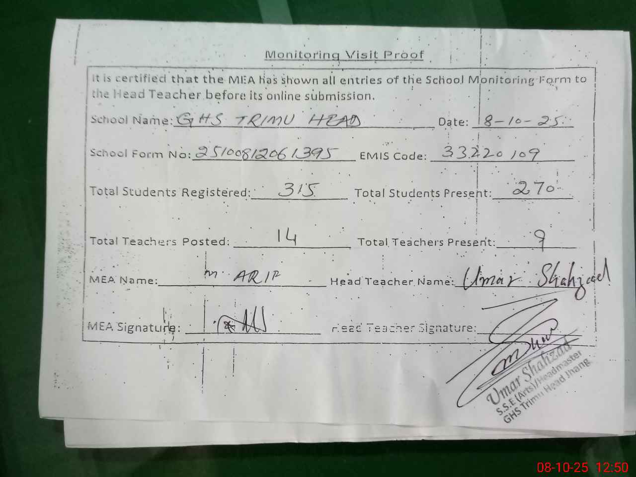 | EMIS Code: 33220109 | Name of School: GHS TRIMU HEAD | |||