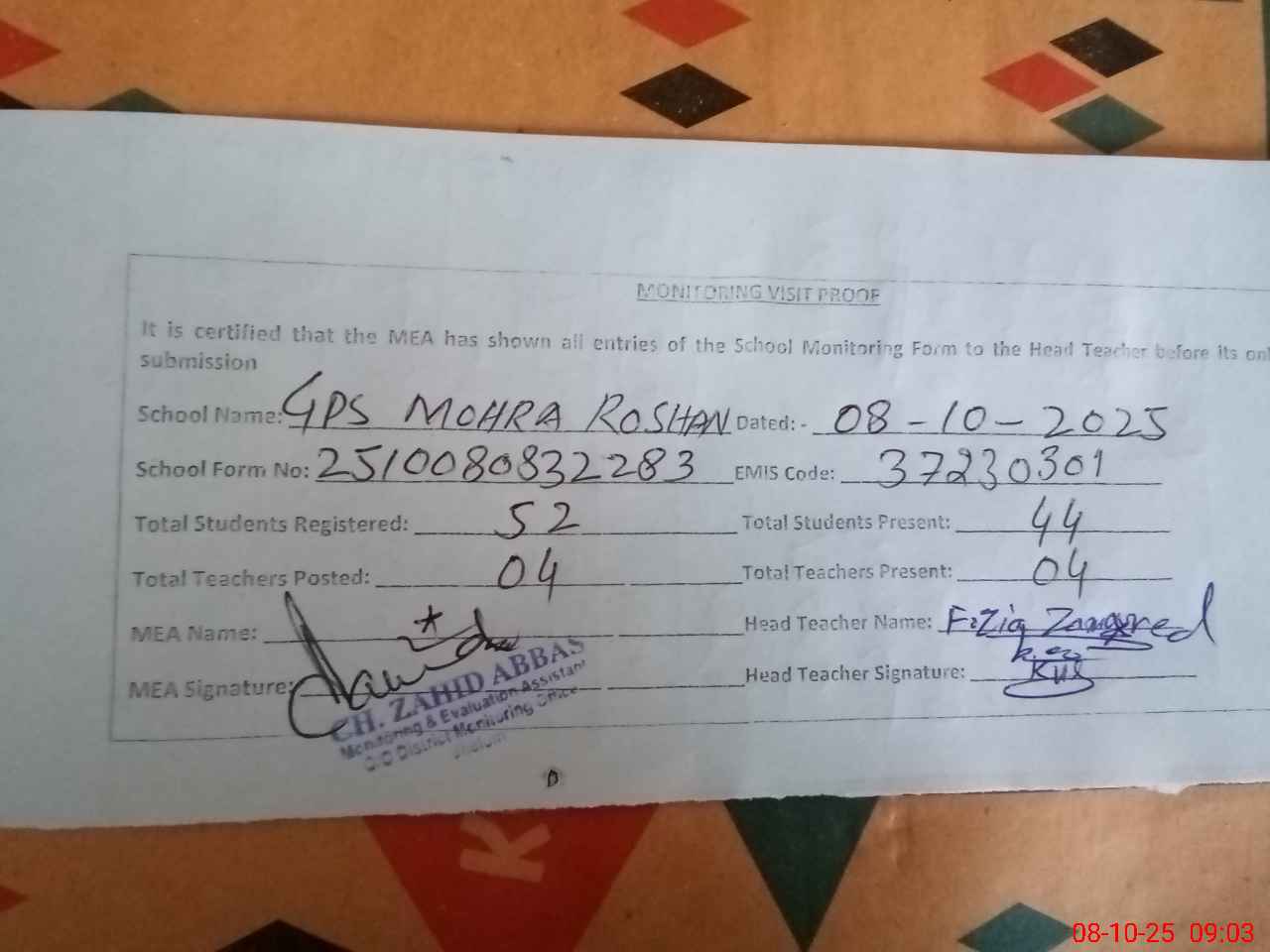| EMIS Code: 37230301 | Name of School: GPS MOHRA ROSHAN | |||
