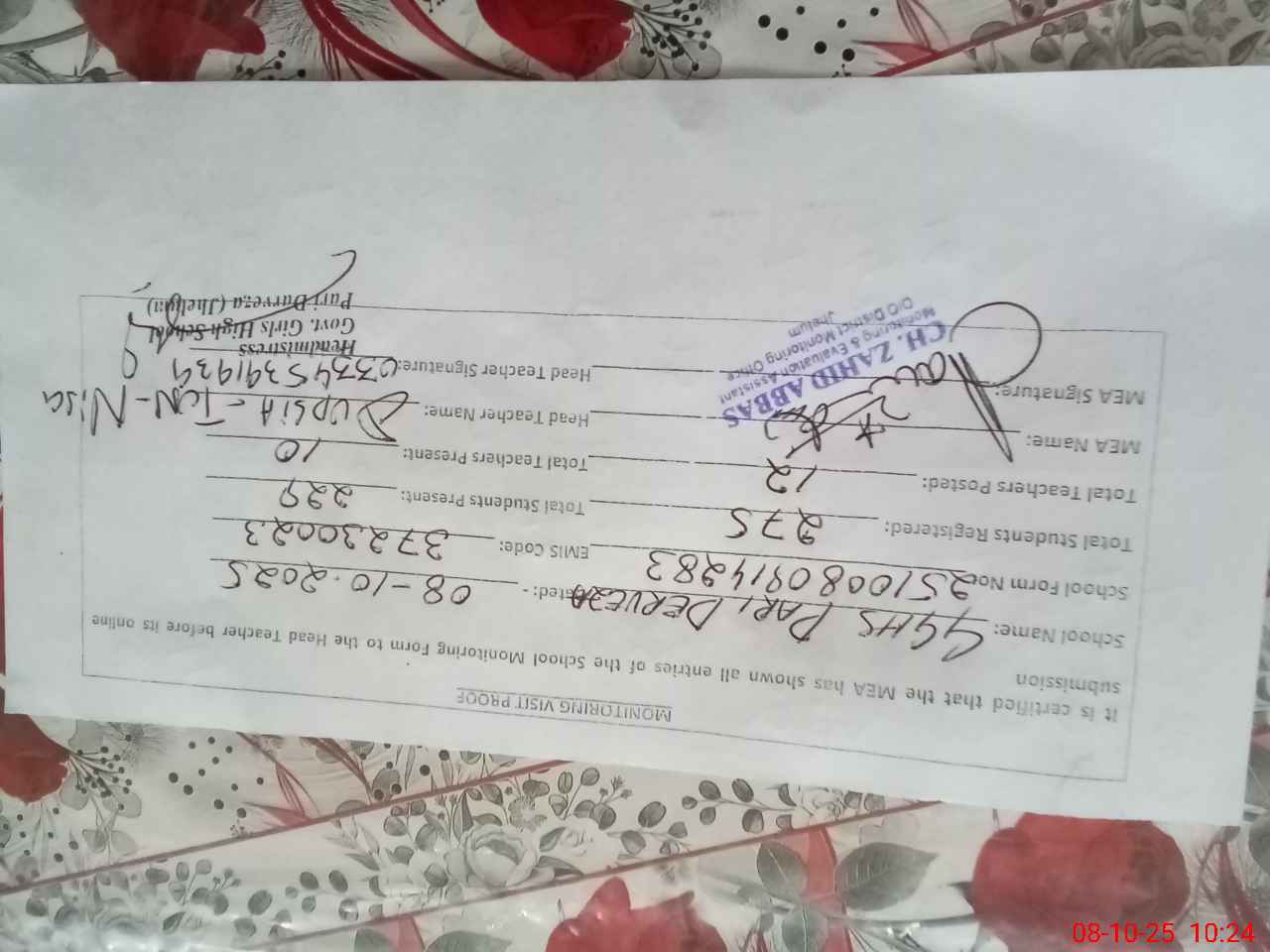 | Certified that this School was Inspected by the Undersigned MEA/DMO Today and the Information Stated Above is as Per Record. | |||||