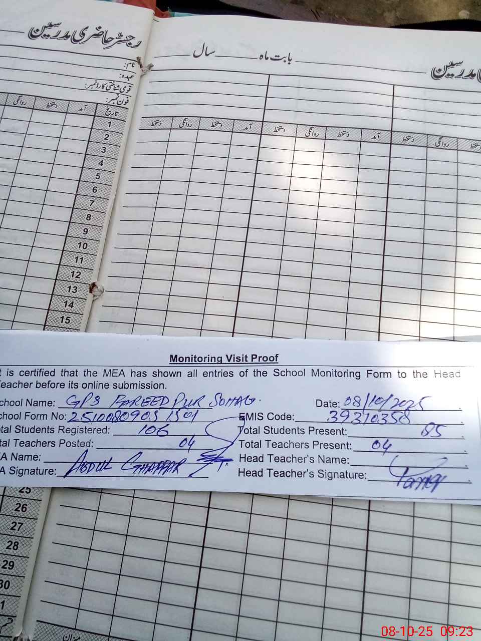 | Attendance Register | Head Teacher | MEA with School | Visit Proof |