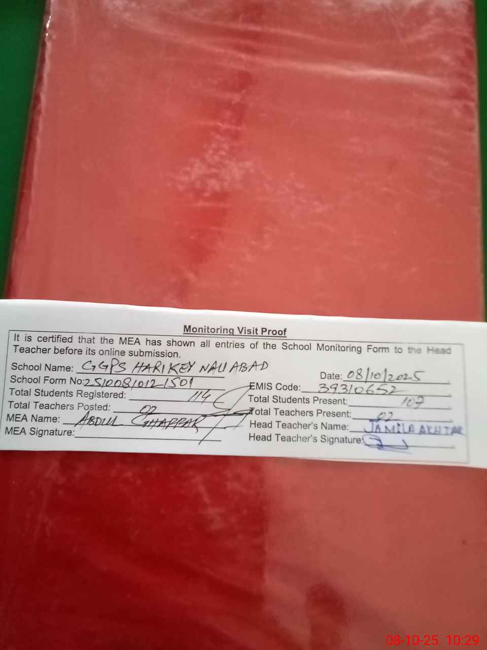 | Attendance Register | Head Teacher | MEA with School | Visit Proof |