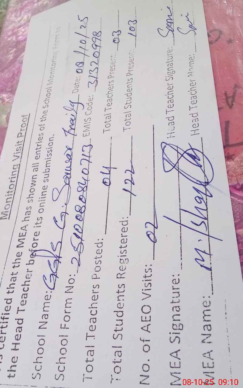 | Certified that this School was Inspected by the Undersigned MEA/DMO Today and the Information Stated Above is as Per Record. | |||||
