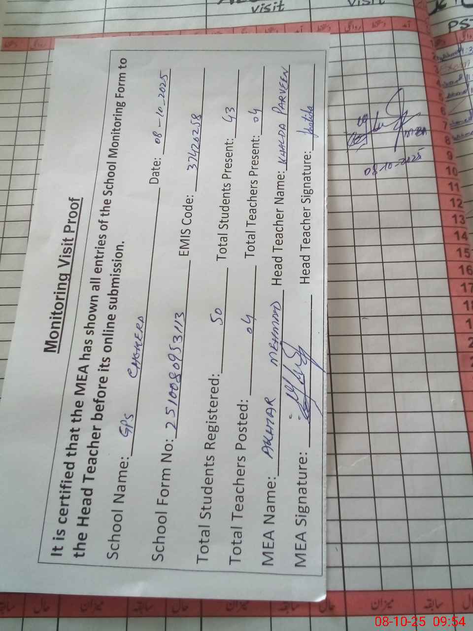 | Attendance Register | Head Teacher | MEA with School | Visit Proof |