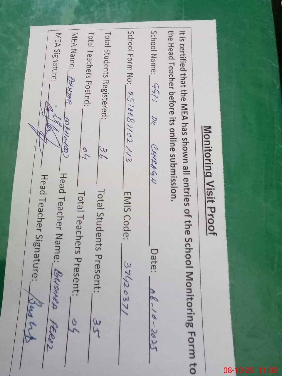| Attendance Register | Head Teacher | MEA with School | Visit Proof |