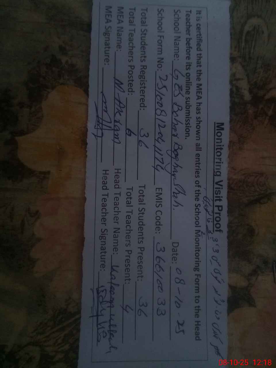 | Attendance Register | Head Teacher | MEA with School | Visit Proof |