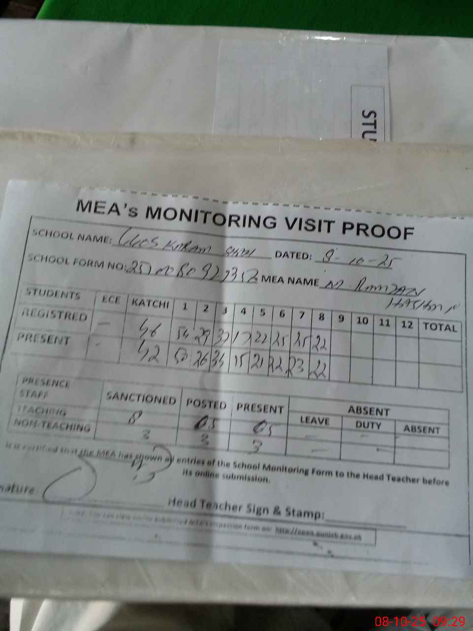 | Attendance Register | Head Teacher | MEA with School | Visit Proof |