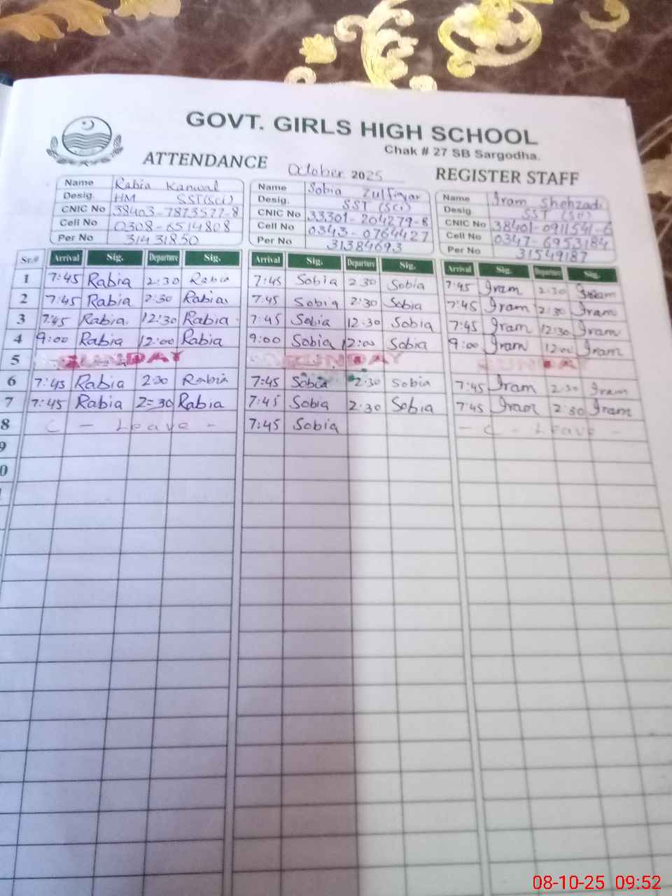 | CNIC | Full Name | Designation | R/C | Absence during last cal. month |