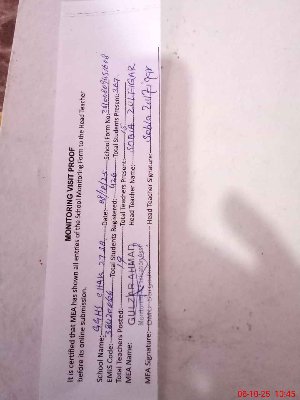 | Attendance Register | Head Teacher | MEA with School | Visit Proof |