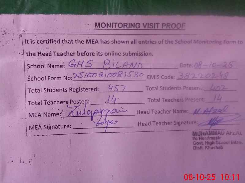 | EMIS Code: 38220248 | Name of School: GHS BILAND | |||