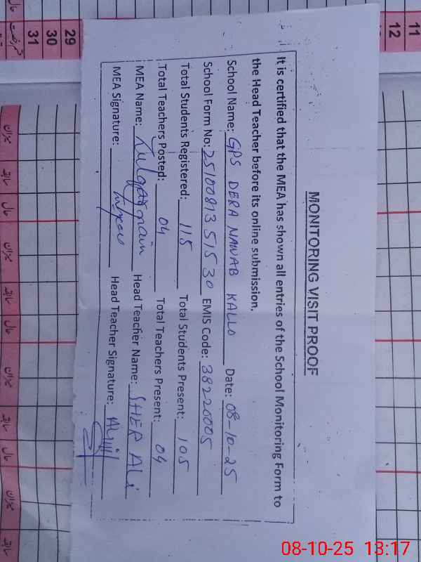 | EMIS Code: 38220005 | Name of School: GPS DERA NAWAB KALOO | |||