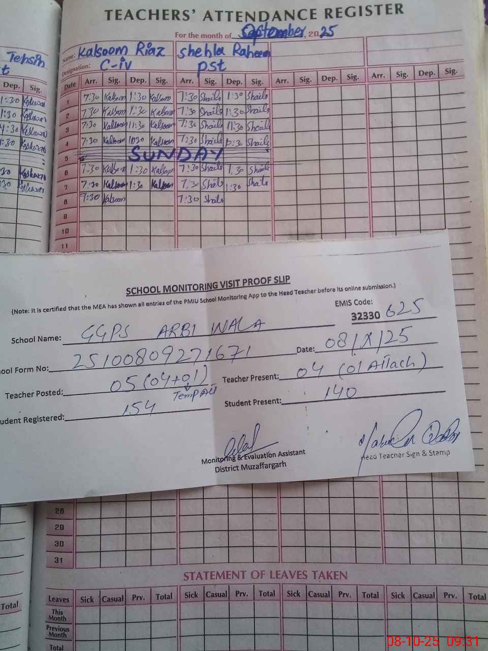 | Attendance Register | Head Teacher | MEA with School | Visit Proof |