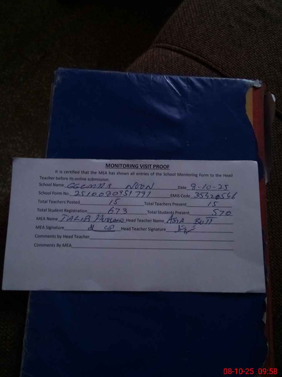 | Attendance Register | Head Teacher | MEA with School | Visit Proof |