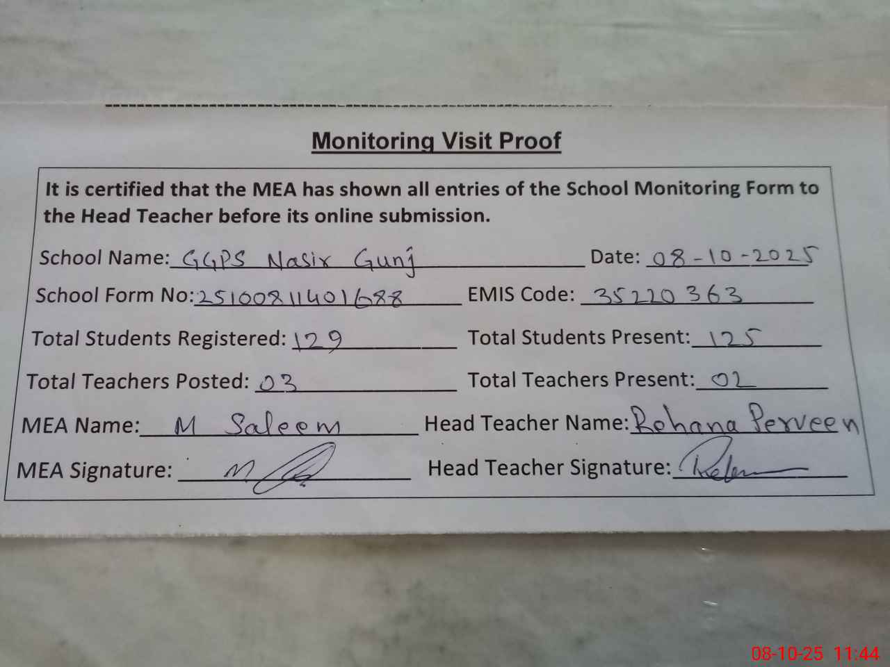 | EMIS Code: 35220363 | Name of School: GGPS NASIR GUNJ | |||