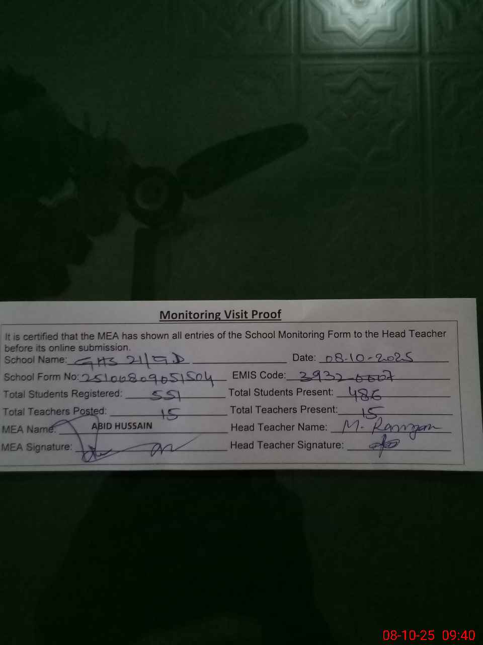 | Certified that this School was Inspected by the Undersigned MEA/DMO Today and the Information Stated Above is as Per Record. | |||||