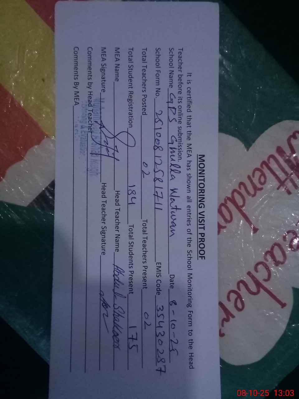 | Attendance Register | Head Teacher | MEA with School | Visit Proof |