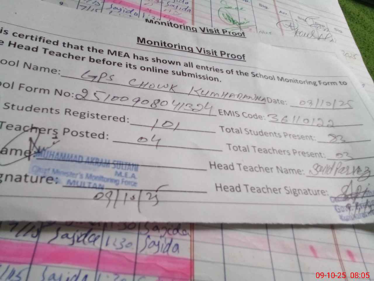 | Monitoring Date: 09-10-2025 | Start Time: 09-10-2025 07:54 AM | End Time: 09-10-2025 08:07 AM | Name of MEA: MU**** AK**** | |