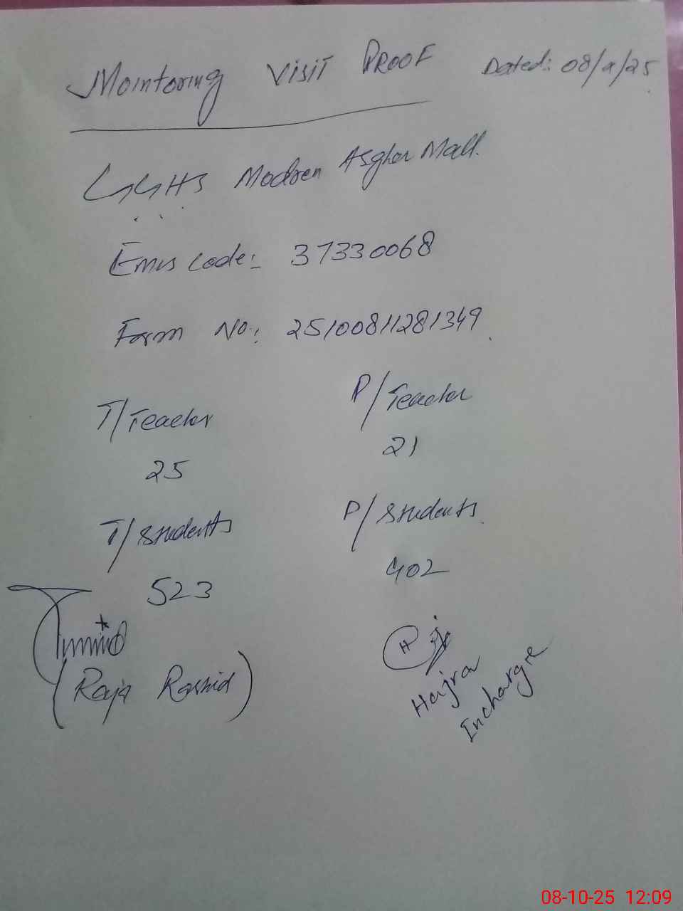 | Certified that this School was Inspected by the Undersigned MEA/DMO Today and the Information Stated Above is as Per Record. | |||||