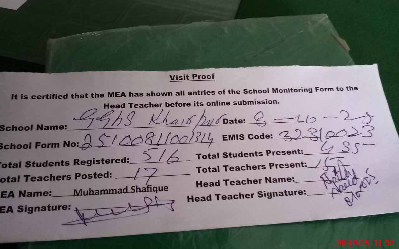 | Certified that this School was Inspected by the Undersigned MEA/DMO Today and the Information Stated Above is as Per Record. | |||||