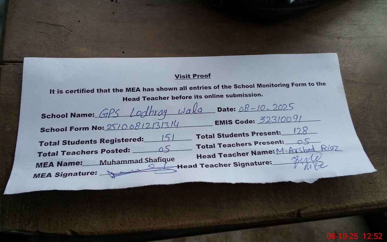 | EMIS Code: 32310091 | Name of School: GPS LODHRAY WALA | |||